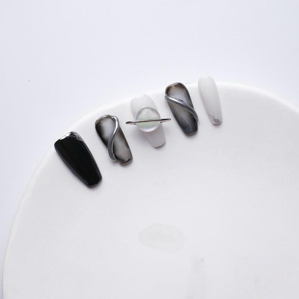 Featuring a monochrome gradient base with 3D metallic planets, these nails bring cosmic elegance to your fingertips. The silver detailing adds a touch of futuristic sophistication.
