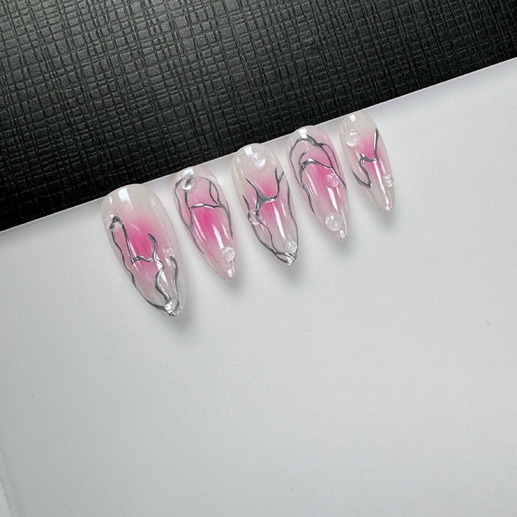 This set features translucent pink tones, abstract silver-black linework, and floating glass-like droplets — like blooming petals frozen in crystal. 💧🌸